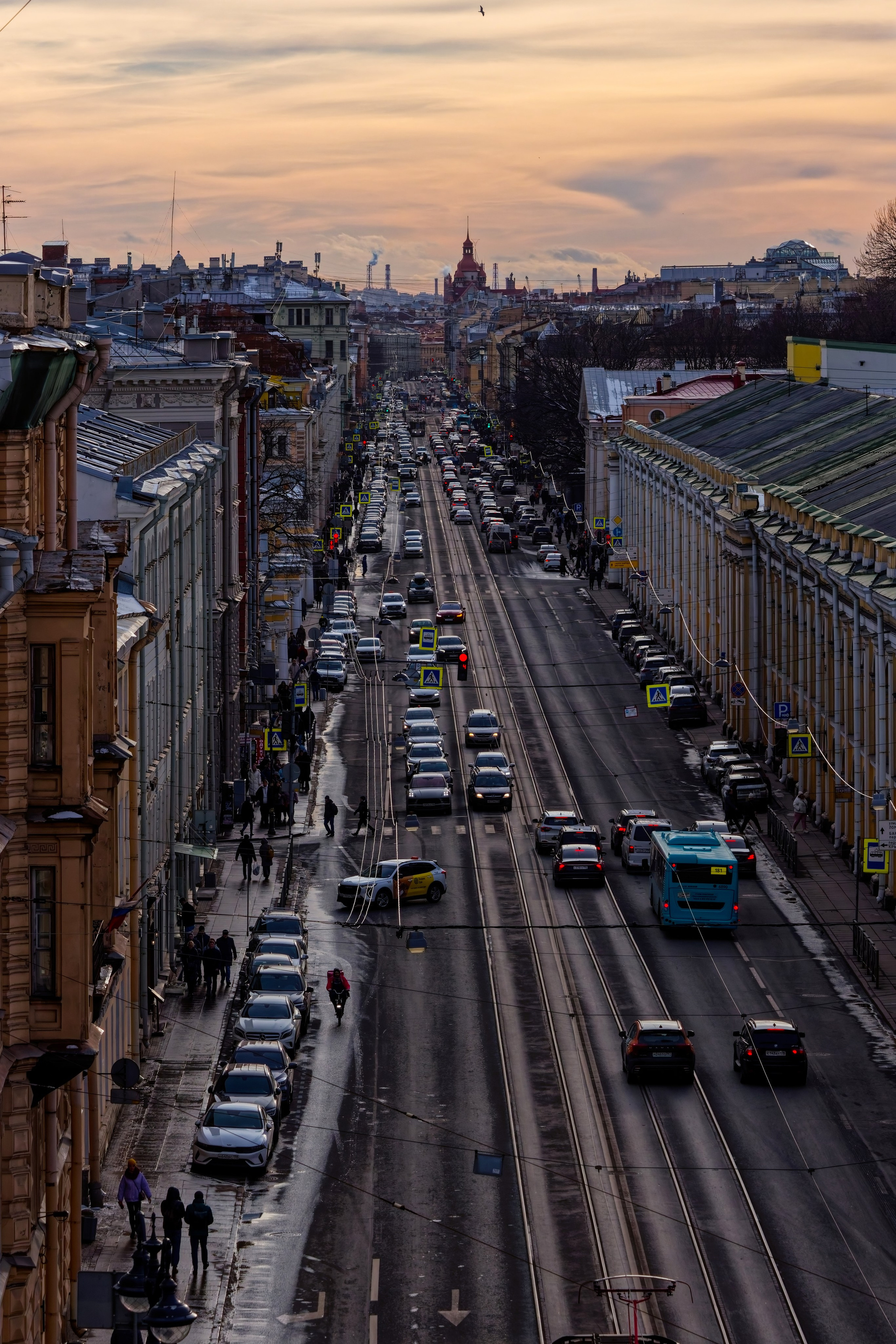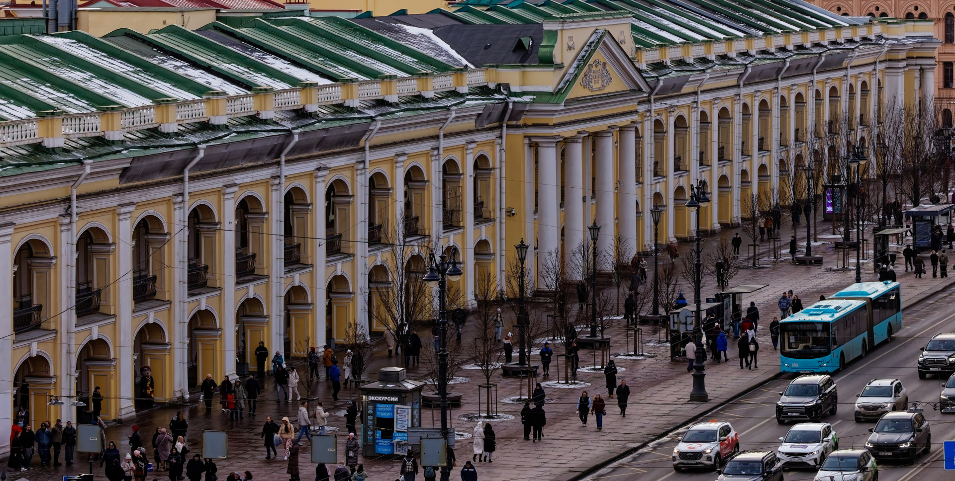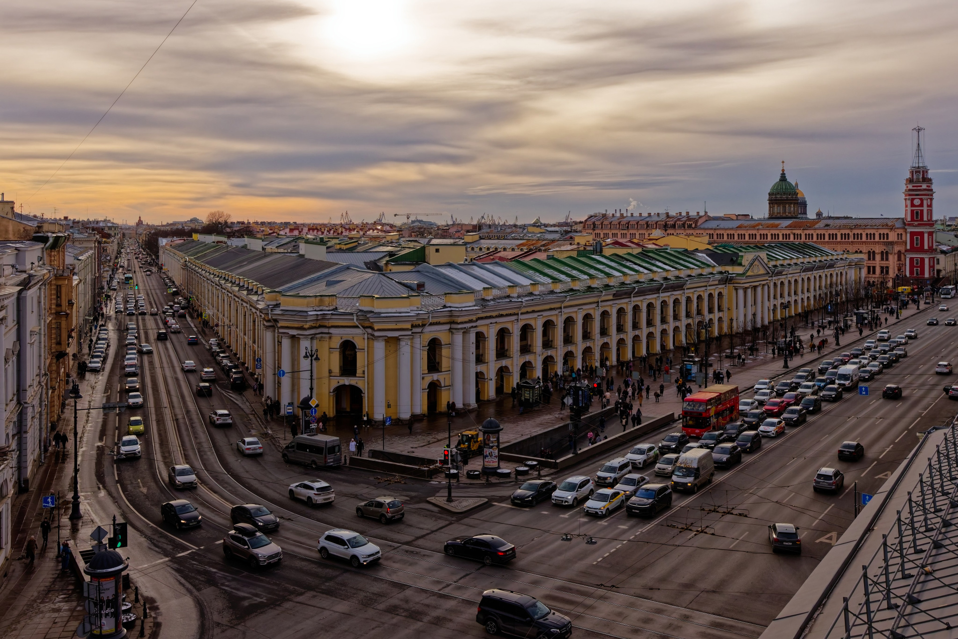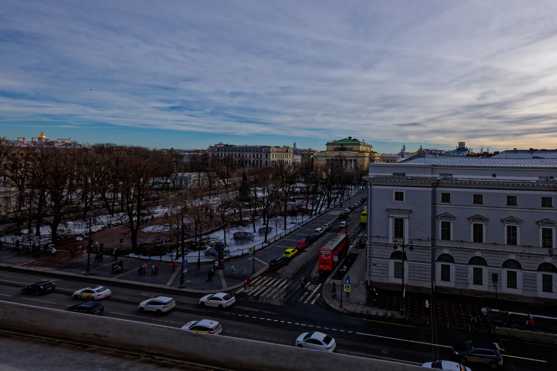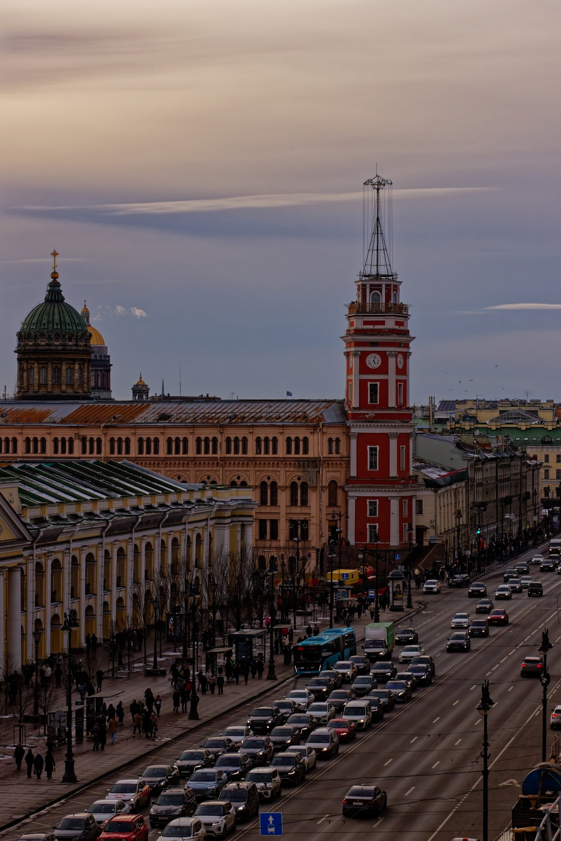 Пересечение Невского и Садовой. Гостиный двор. Екатерининский сад. Александринский театр. Думская башня. Купол Казанского собора. И — если знать, куда смотреть — колоннада Исаакия, выглядывающая из-за крыш.